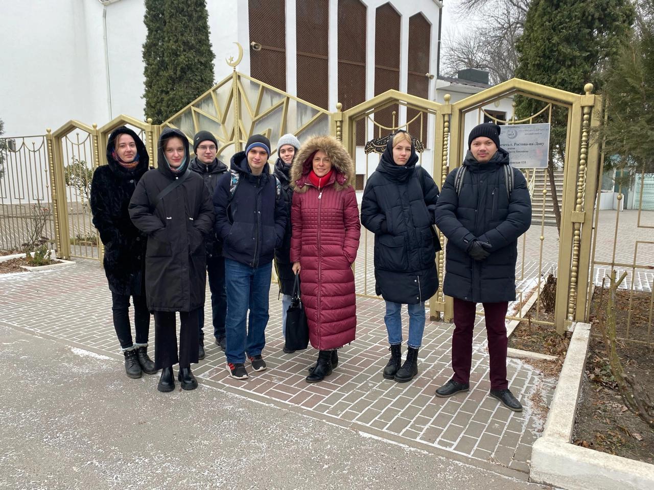 В соборной мечети г. Ростова-на-Дону прошла экскурсия для студентов Института истории и международных отношений Южного Федерального Университета, обучающихся по направлению история. Группу студентов курировала преподаватель - кандидат исторических наук, доцент кафедры отечественной истории XX-XXI веков Табунщикова Людмила Викторовна.