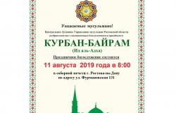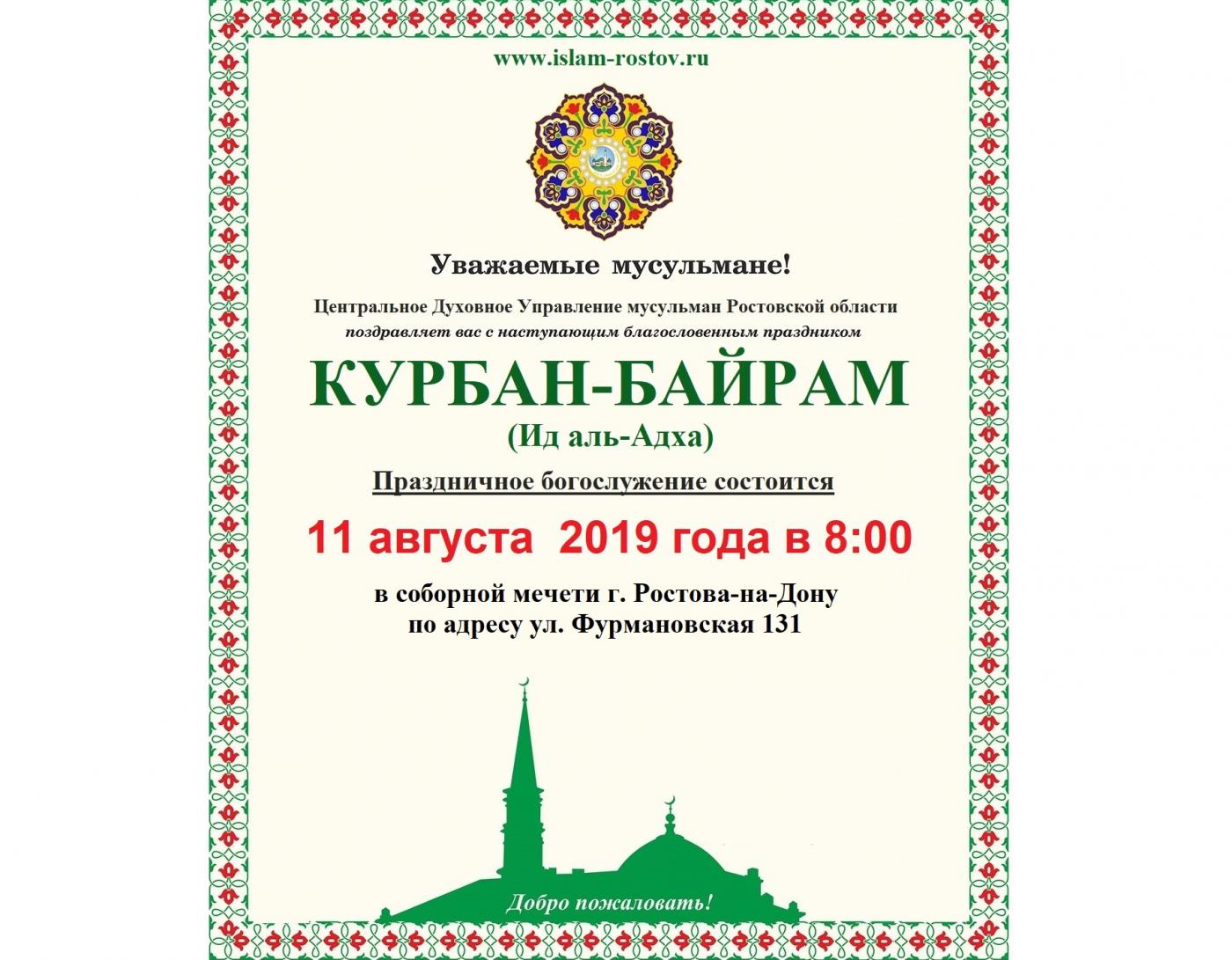 Центральное Духовное Управление мусульман Ростовской области поздравляет Вас с наступающим праздником жертвоприношения Курбан-байрам (Ид аль-Адха) и объявляет о том, что праздничная молитва  состоится Инша Аллах  11 августа 2019 года.