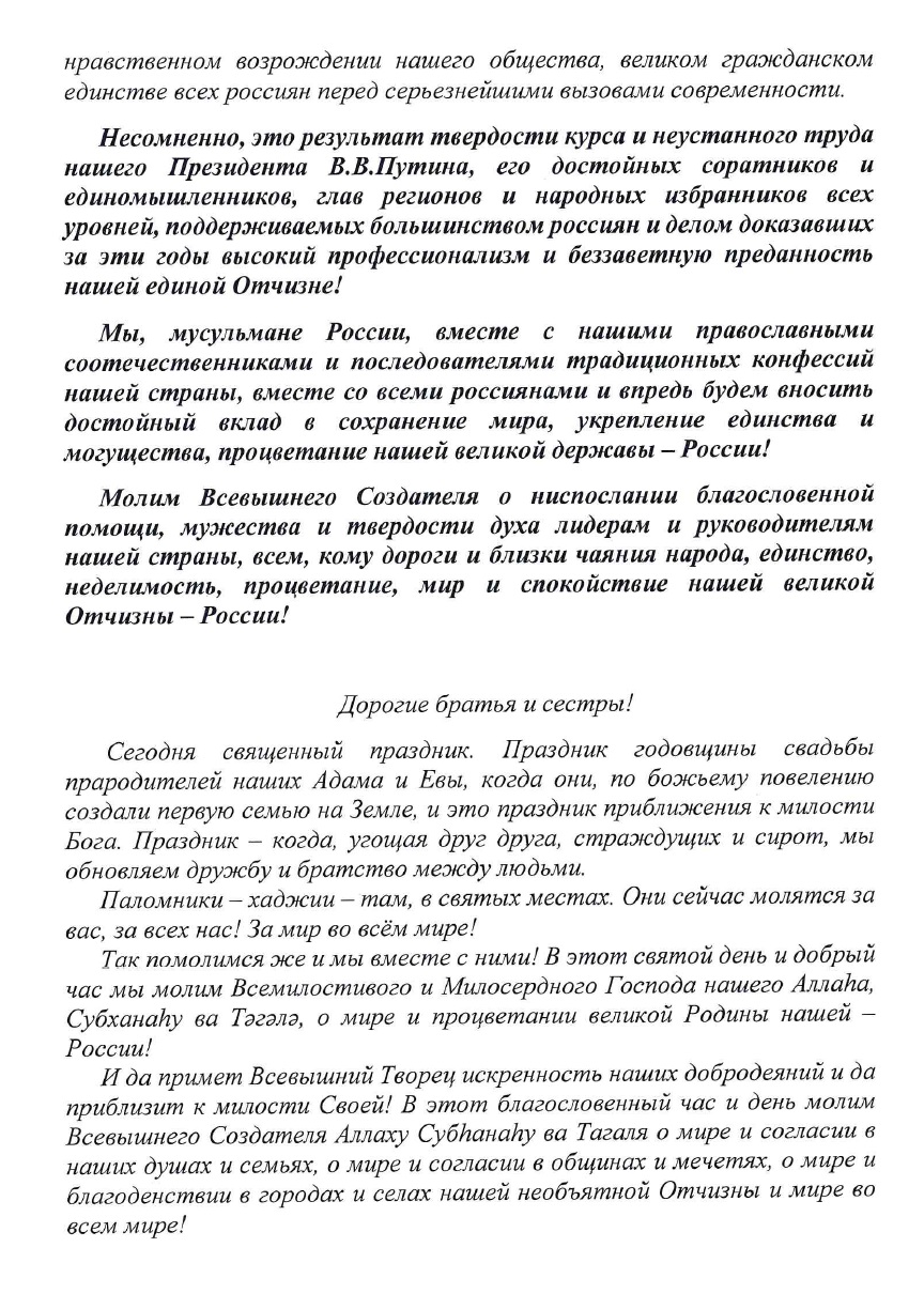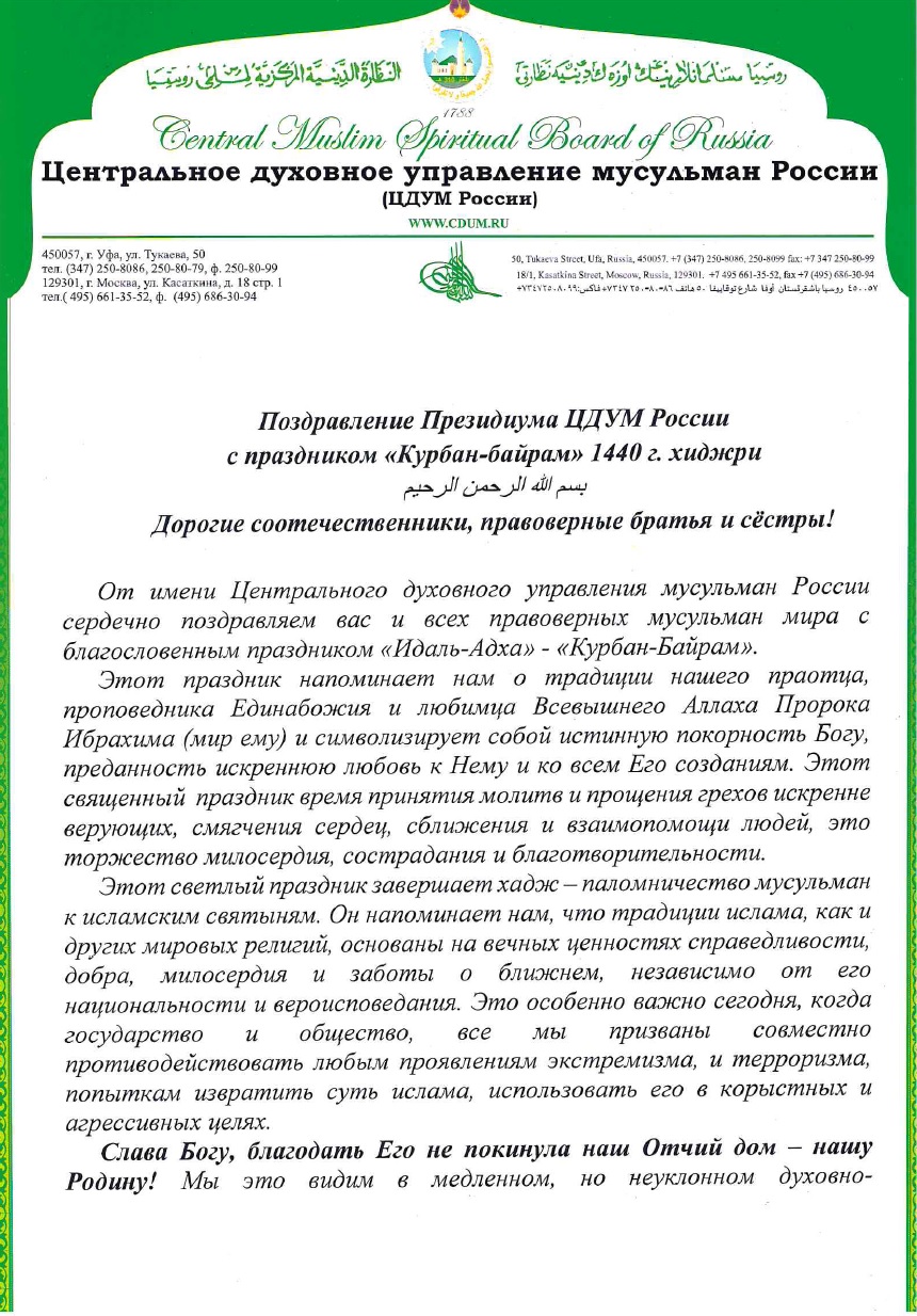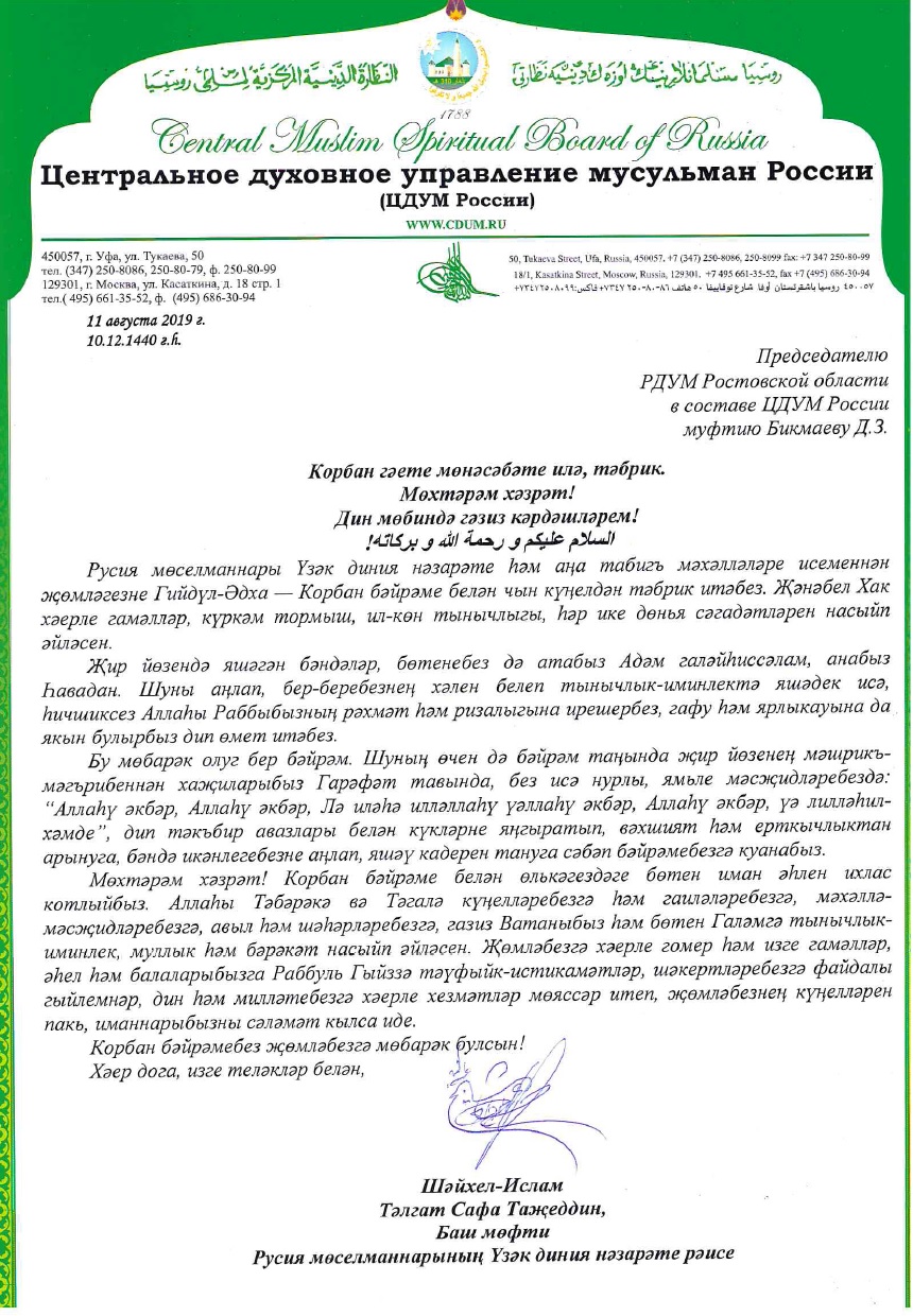 С поздравлениями к верующим обратился муфтий Ростовской области, председатель Центрального духовного управления мусульман Ростовской области Джафар хазрат Бикмаев, «Уважаемые братья и сестры! От всей души поздравляю вас с праздником Курбан-Байрам. Это один из величайших праздников в исламе. Этот праздник очень важен, он особенно актуален сегодня, потому что сближает людей. Состоятельные люди должны совершить жертвоприношения и поделиться жертвенным мясом с малоимущими, родственниками и друзьями».