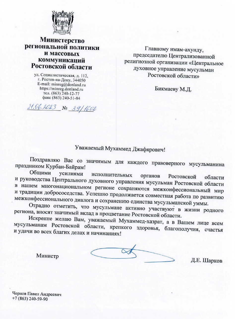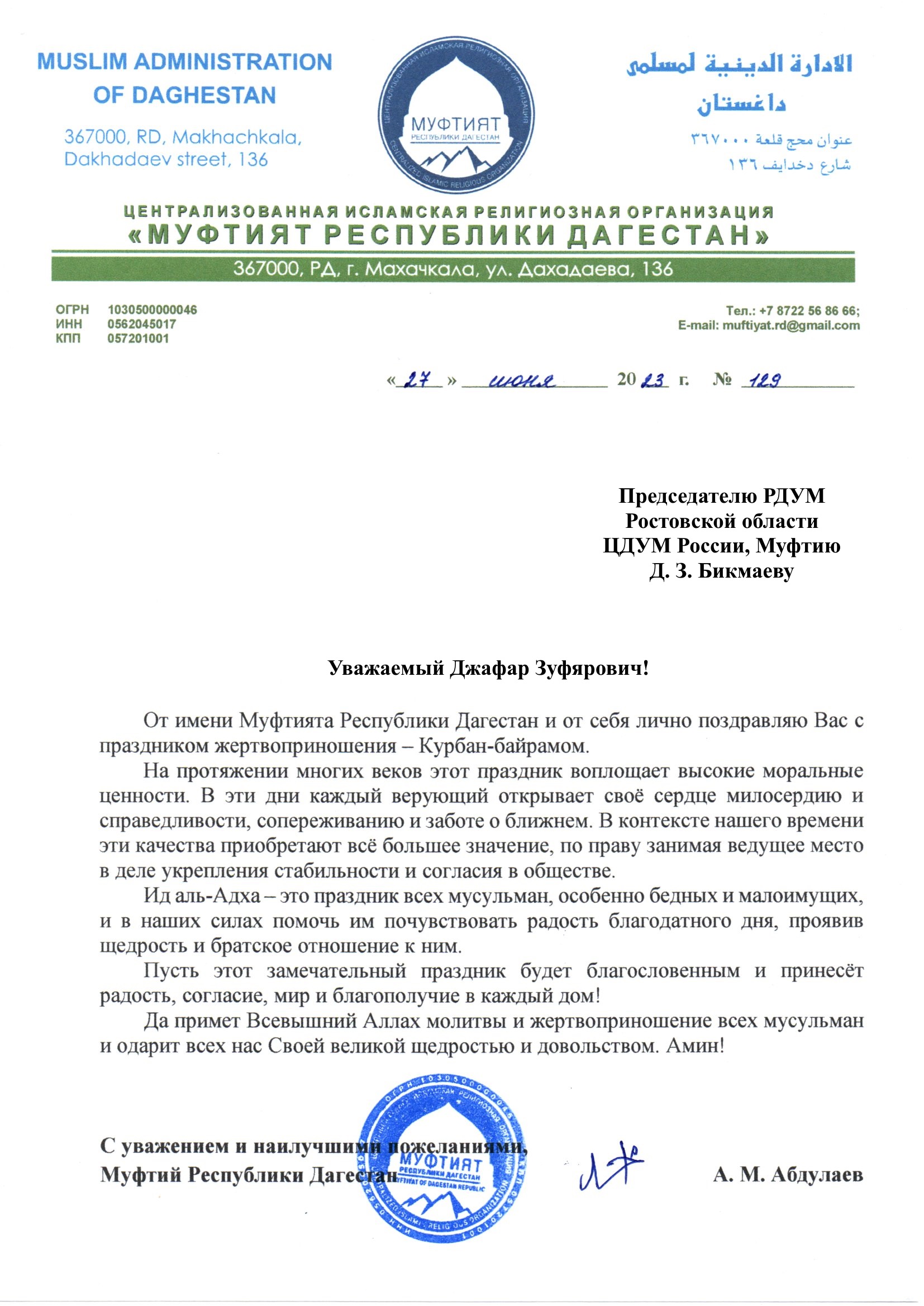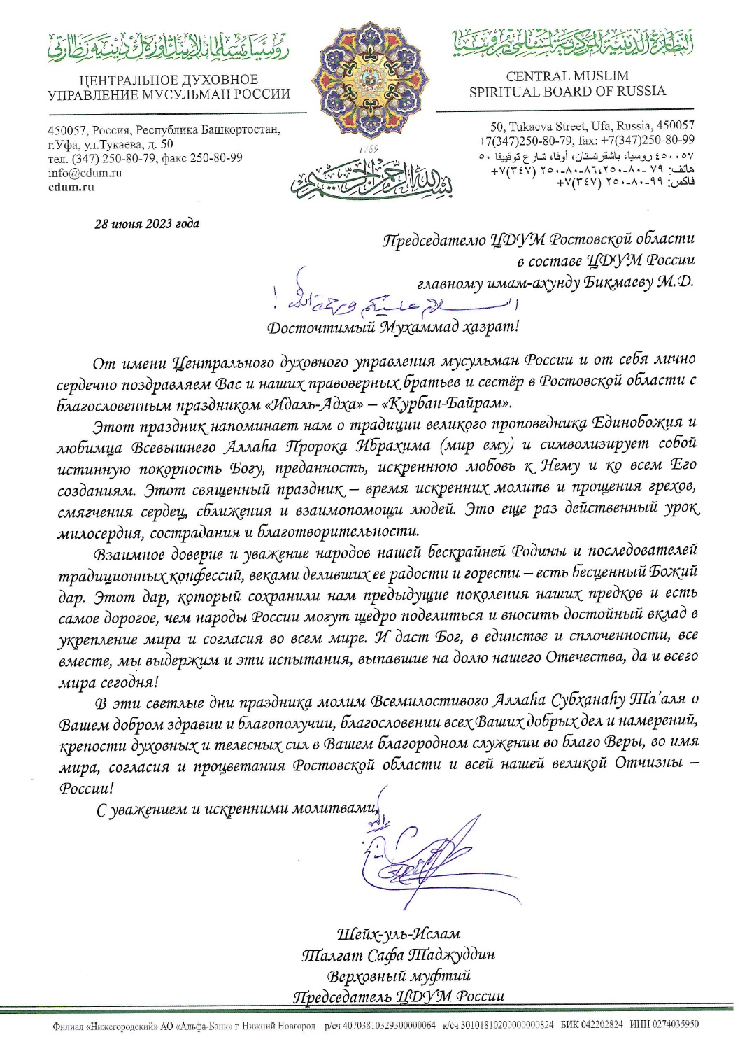 Традиционно, в адрес мусульман были направлены поздравления от Президента Российской Федерации Владимира Владимировича Путина, Верховного муфтия России, Шейх-уль-ислама Талгат хазрата Таджуддина, Министра региональной политики и массовых коммуникаций Ростовской области Дмитрия Евгеньевича Шаркова, Главы Администрации города Ростова-на-Дону Алексея Валентиновича Логвиненко, а также от глав Духовных управлений мусульман различных регионов России.
