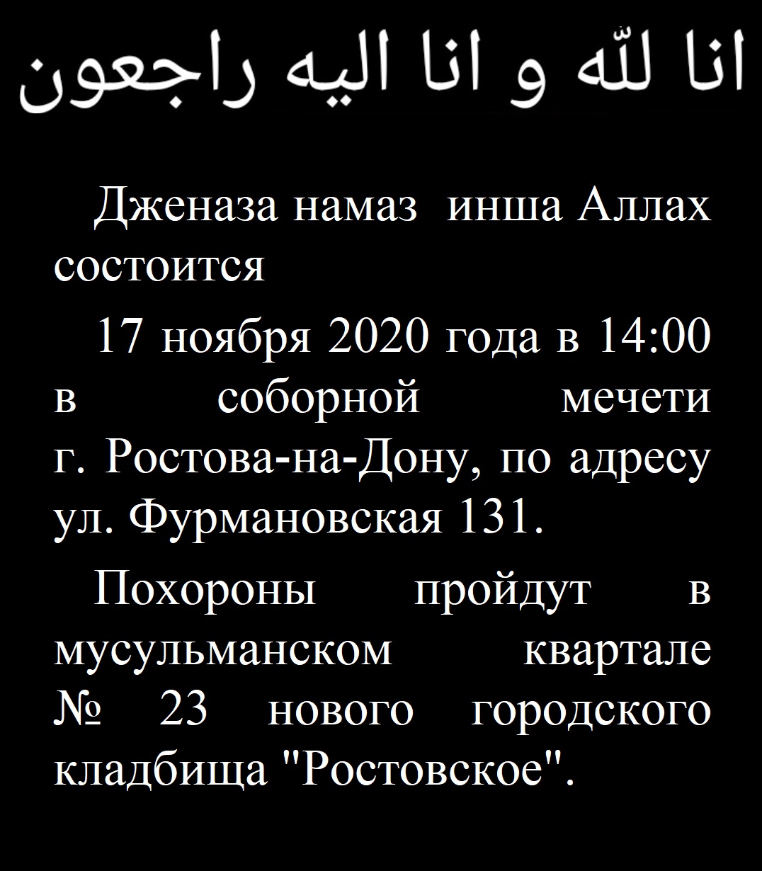 Дженаза намаз (заупокойная молитва) инша Аллах состоится 17 ноября 2020 года в 14:00 в построенной Джафяр хазратом Бикмаевым соборной мечети г. Ростова-на-Дону, по адресу ул. Фурмановская 131. Похороны пройдут в мусульманском квартале № 23 нового городского кладбища "Ростовское".