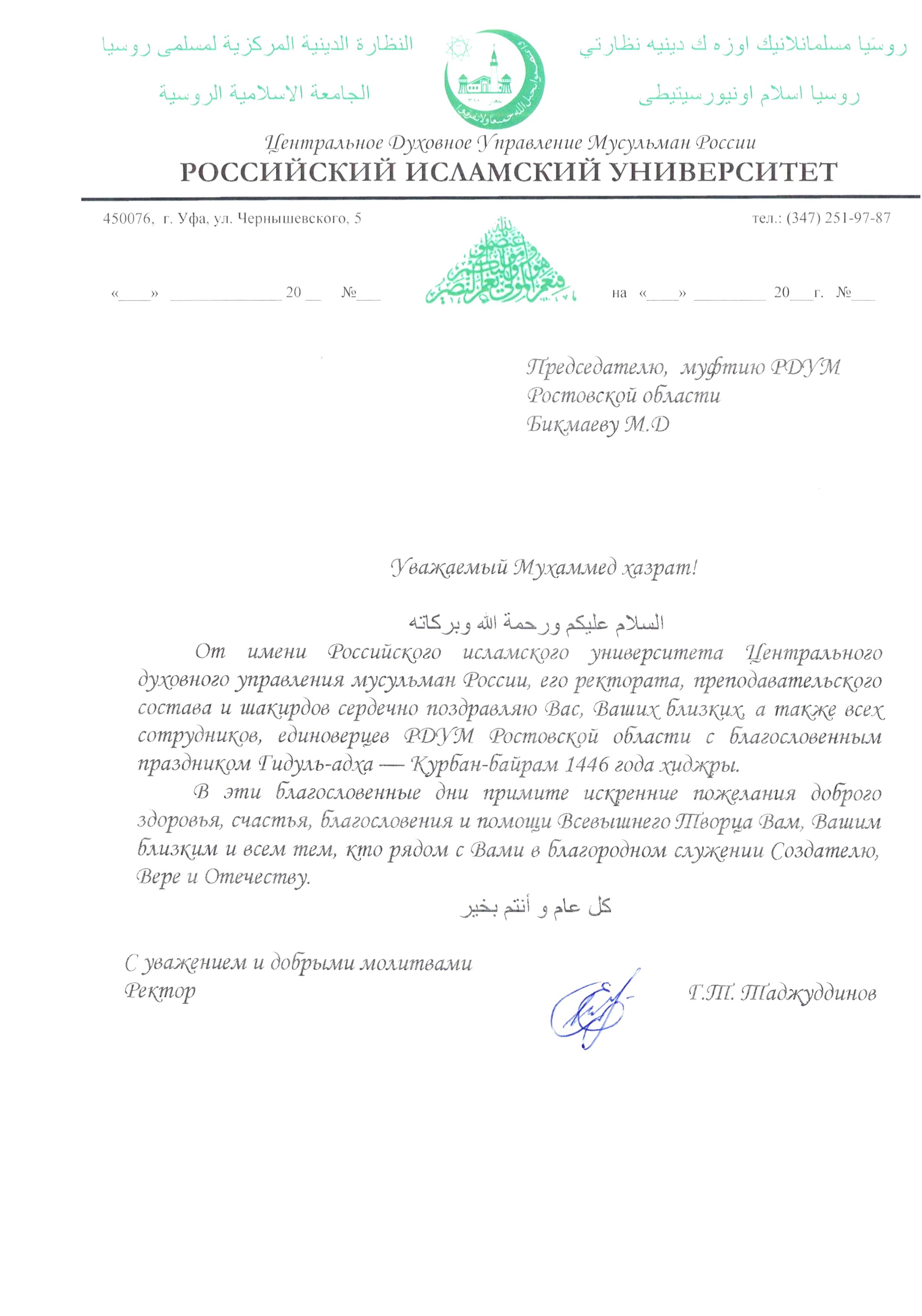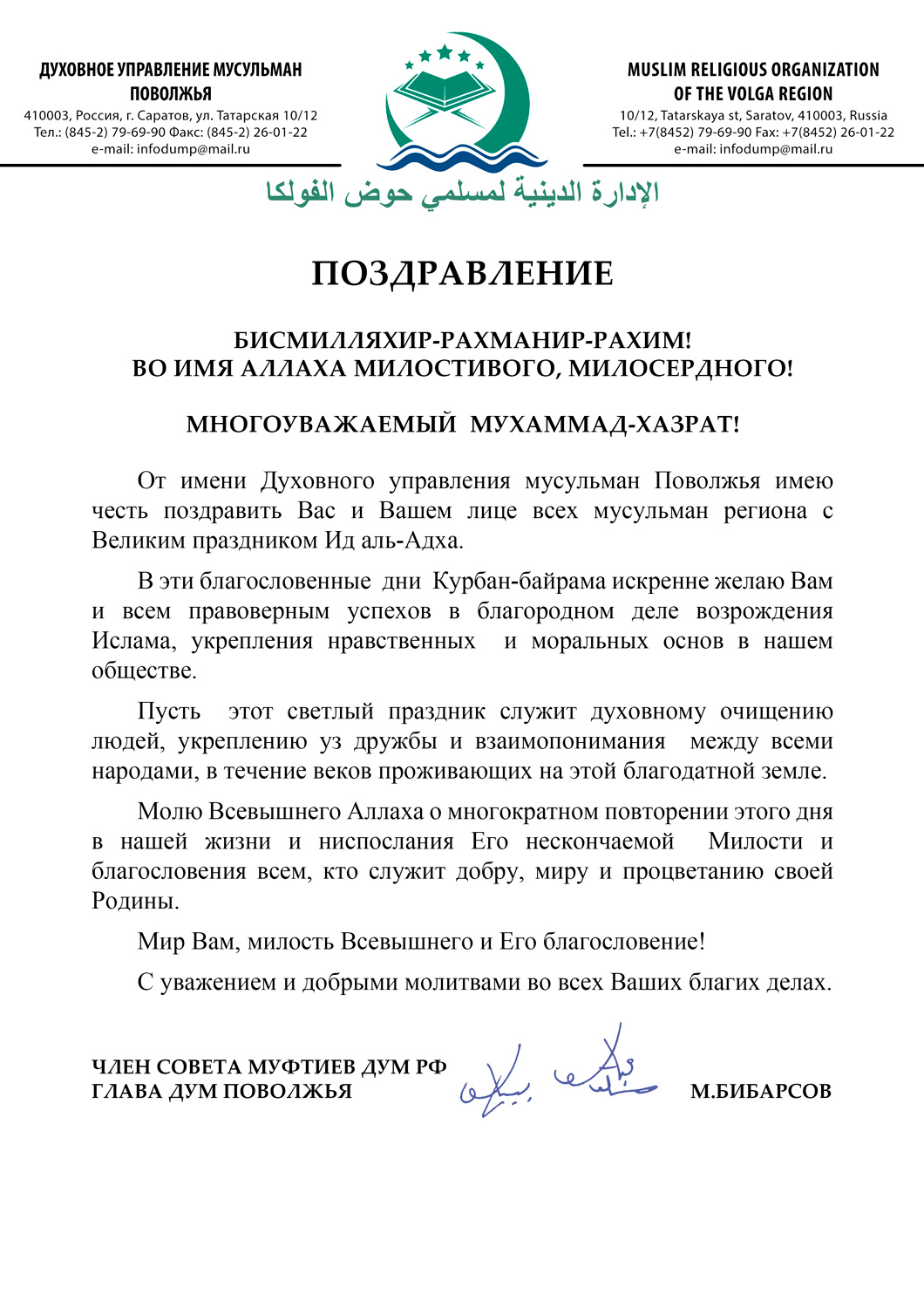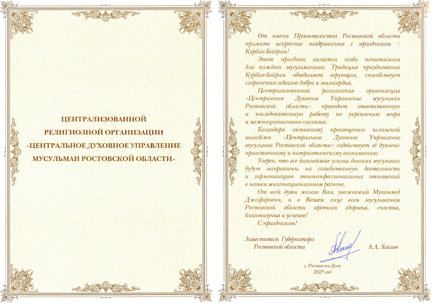 Традиционно, в адрес мусульман были направлены поздравления от Президента Российской Федерации Владимира Владимировича Путина, Верховного муфтия России, Шейх-уль-ислама Талгат хазрата Таджуддина, заместителя Губернатора Ростовской области Артема Андреевича Хохлова и от глав Духовных управлений мусульман различных регионов России.