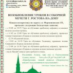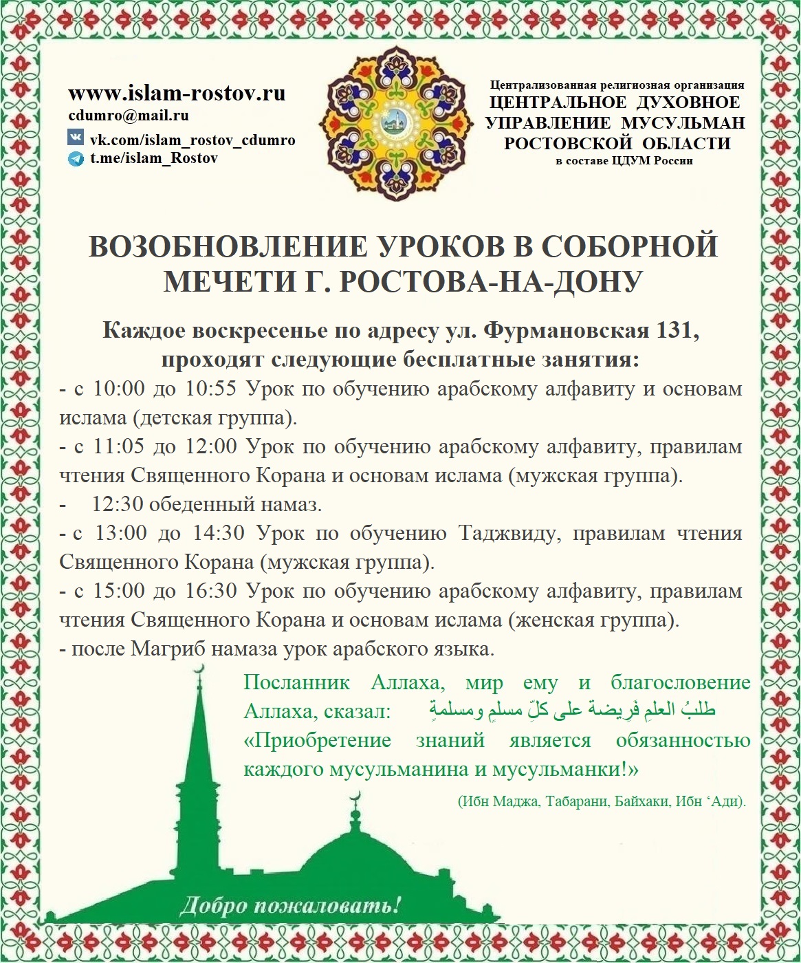 В соборной мечети г. Ростова-на-Дону, с началом нового учебного года, возобновились бесплатные занятия по обучению правилам чтения Священного Корана (Таджвиду), основам ислама и арабскому языку для детей и взрослых. Занятия проходят каждое воскресенье в соборной мечети г. Ростова-на-Дону, по адресу ул. Фурмановская 131, согласно следующего расписания.